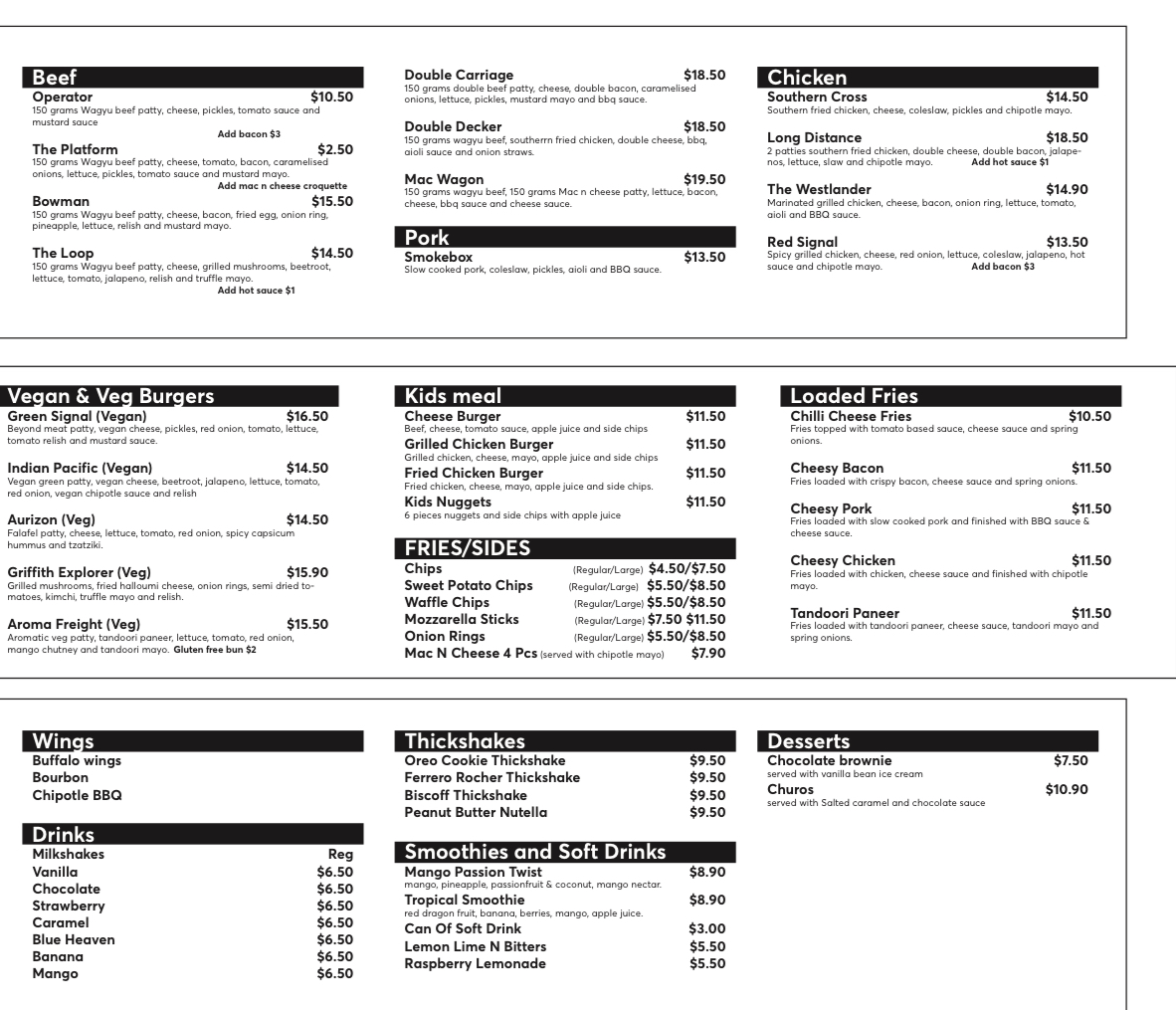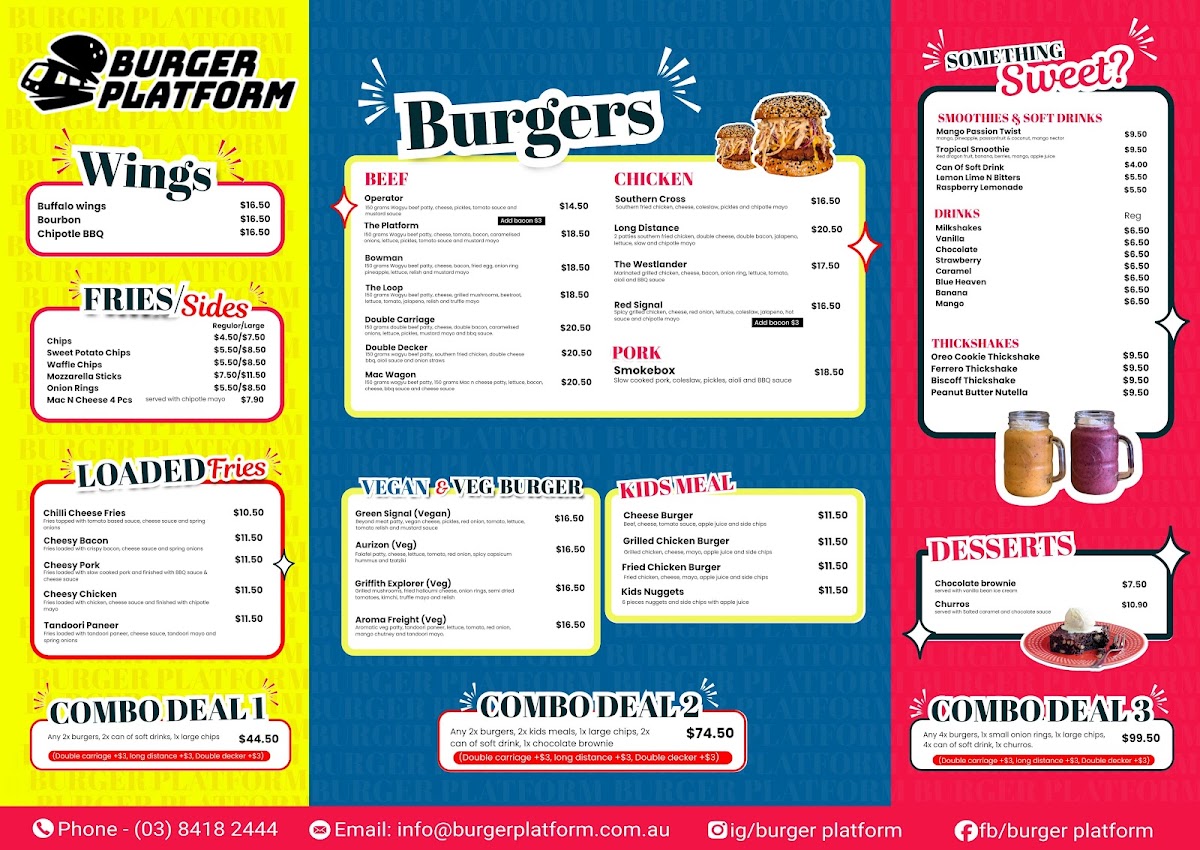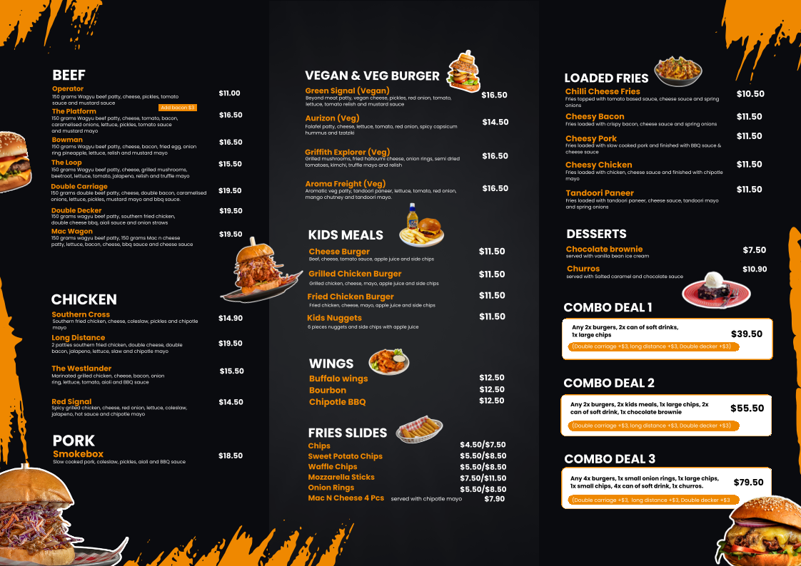 For burger enthusiasts, Burger Platform serves an impressive selection. Their BEEF Burgers include popular options like Operator, The Platform, BowmanThe Loop, and the hearty Double Carriage. If you're in the mood for something lighter, their CHICKEN Burgers such as Southern Cross, Long Distance, The Westlander, and Red Signal are fantastic choices. For pork lovers, the Smokebox burger is a must-try.