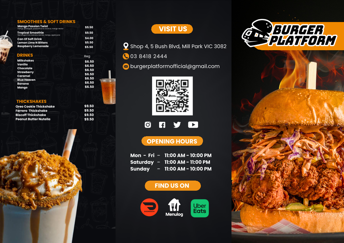 Burger Platform also goes beyond the usual with their LOADED Fries like Chilli Cheese Fries, Cheesy Bacon, Cheesy Pork, Cheesy Chicken, and Tandoori Paneer, making for a filling and flavorful side dish. To quench your thirst, you can choose from a range of Smoothies & Soft Drinks like Mango Passion Twist, Tropical Smoothie, Can of Soft Drink, Lemon Lime N Bitters, and Raspberry Lemonade. For a richer experience, try one of their creamy Milkshakes (Vanilla, Chocolate, Strawberry, Caramel, Blue Heaven) or indulge in a decadent Thickshake like the Oreo Cookie, Ferrero, Biscoff, Peanut Butter Nutella, or the classic Vanilla or Chocolate.
